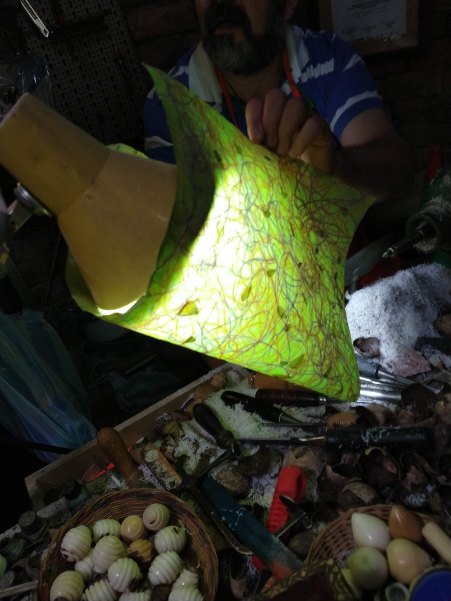 The world is concerned about waste. Do you see all the waste produced when the nut is carved? Before, this waste was thrown away. Now they are using the byproduct to make paper thick enough that you could use it as a lampshade.